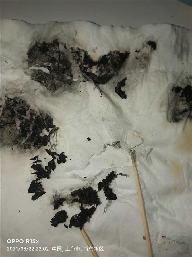 郭先生提供给极目新闻记者的照片显示,他吐出来的东西是被咀嚼过的,颜色呈焦黑色,其中混杂着几截透明的塑料片。当晚,郭先生找到了电商平台卖家客服,客服回应表示抱歉,并提出可以补偿10元钱。客服告诉郭先生,他们是代销,郭先生可以找生产厂家反映此事。