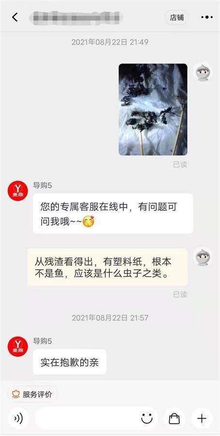 据郭先生介绍,他于7月底在某电商平台购买了一些小鱼干零食。8月22日,他拆开其中一包开吃,咀嚼的时候发现有些粘,他感觉不像是鱼干的味道,便吐在了纸巾上。郭先生说,他发现刚刚吃进去的是一团黑色的东西,形状不像是鱼干,“里面还有塑料”。
