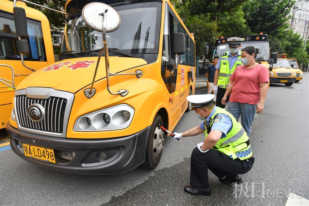 8月26日,武昌新生路一幼儿园门前,民警仔细对停放的每辆校车标志、轮胎、安全带、安全锤、刹车、灭火器、三角架、安全带及校车驾驶人驾驶资格证等进行检查,并对幼儿园接送学生车辆数量、运行时间、行车路线进行了核对。