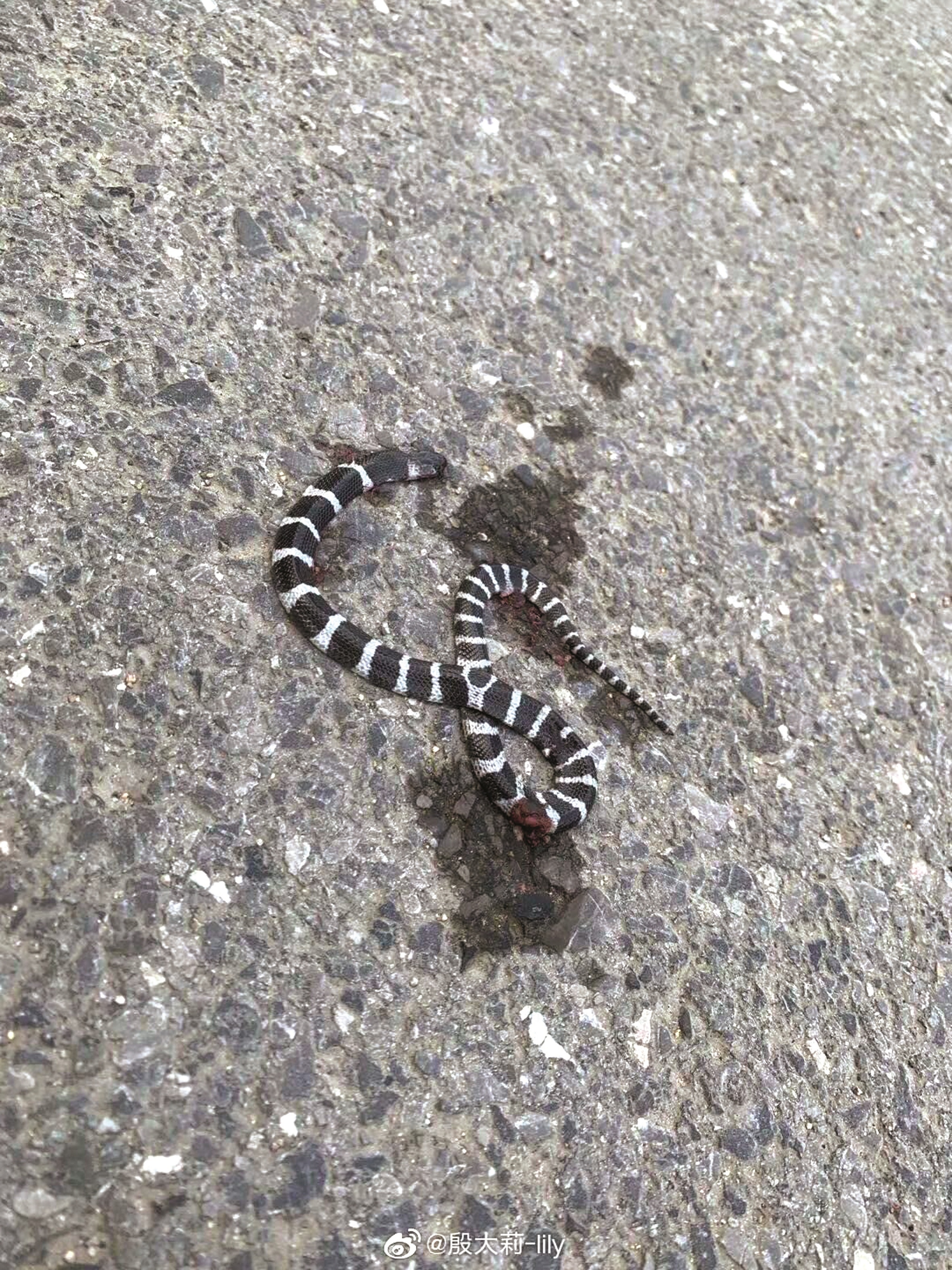 在殷女士小区业主群的一张照片中,记者看到,一条尾巴细长、背部有白环和黑环相间排列的蛇被轧死在路边,而该蛇的体长不过20厘米。