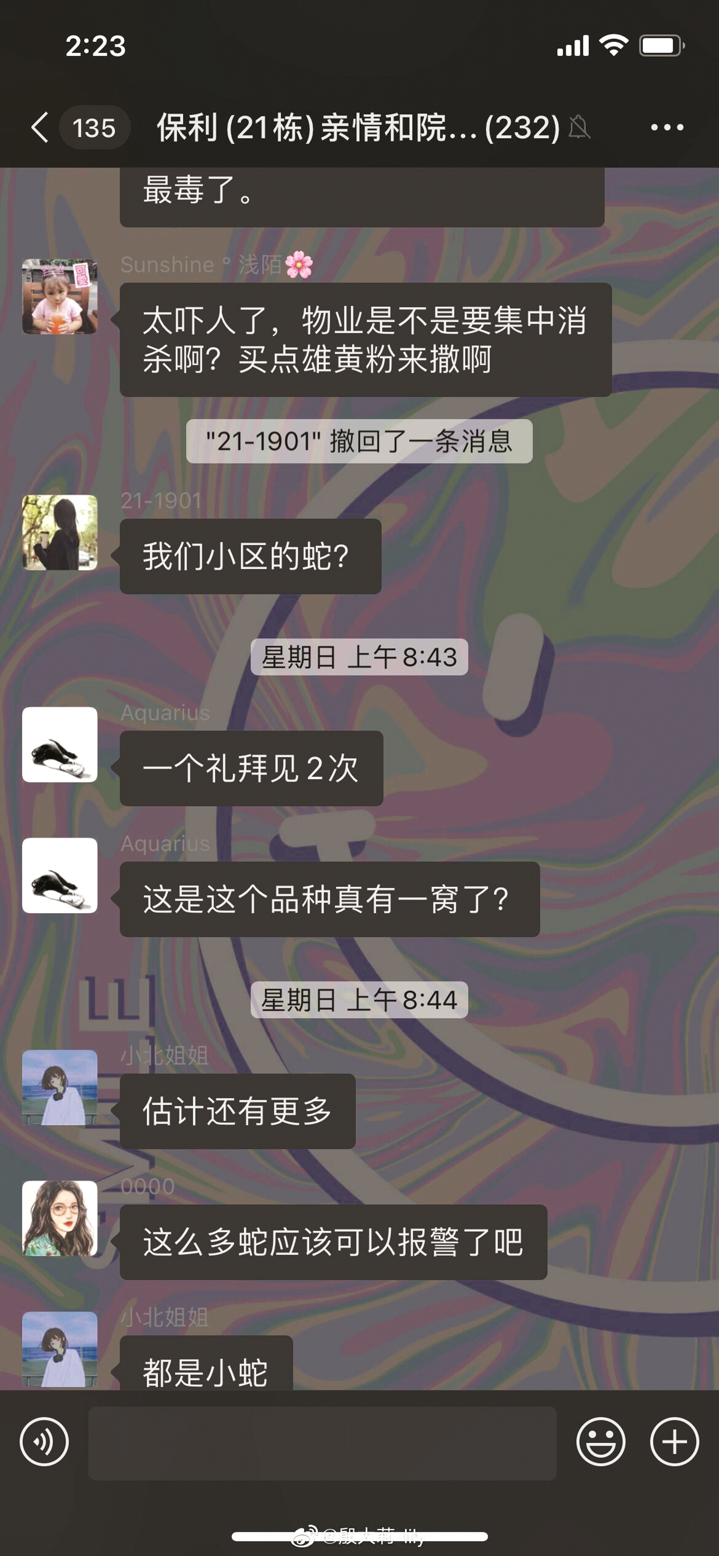 与此同时,物业还组织工作人员在小区不间断巡查,试图找寻蛇的踪迹。小区物业还通过业主群提醒一楼住户做好防范,并建议在庭院中撒白酒、大蒜或者雄黄粉等刺激性物品,用以驱蛇。