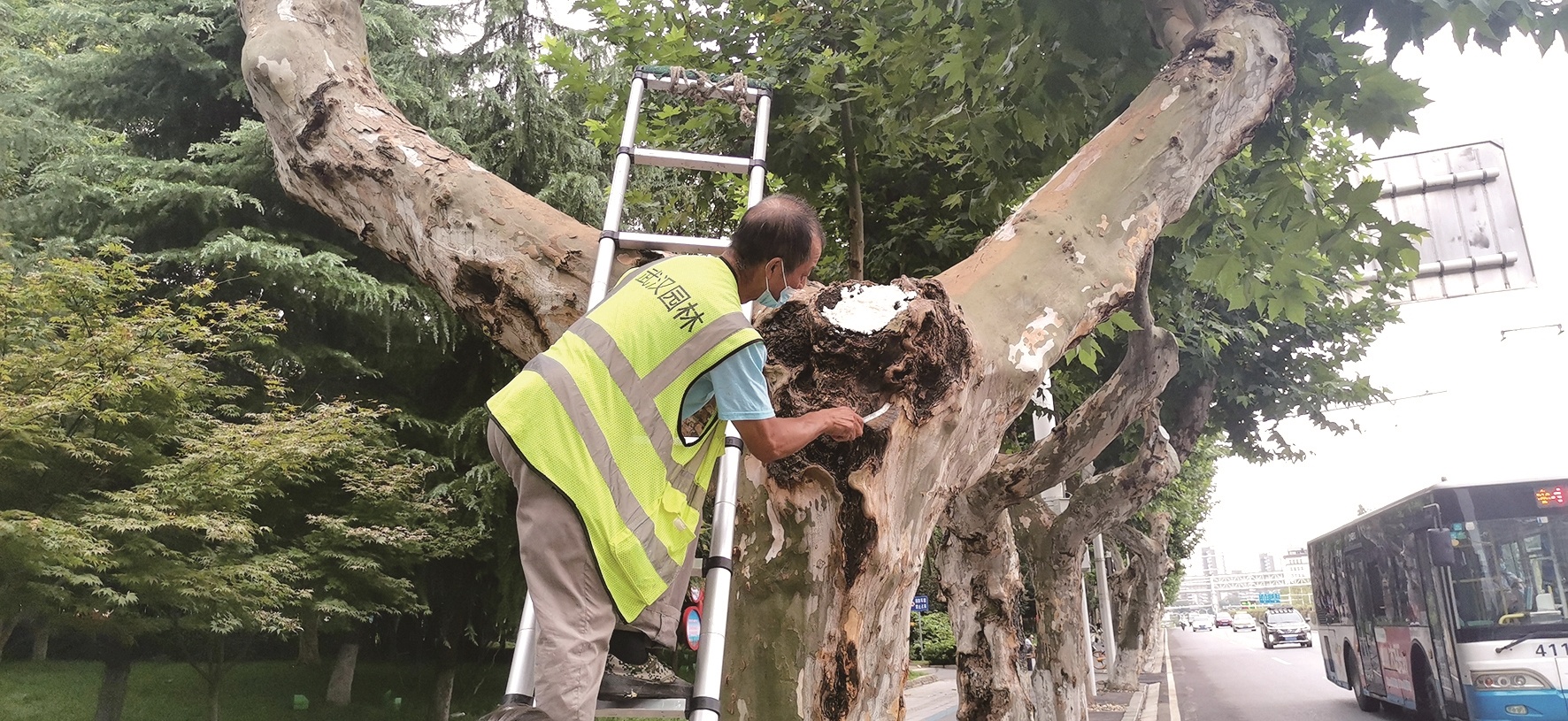 26日清晨6时许,微凉的风吹起,陈发耀师傅和同事们就带着多种修补工具来到武昌阅马场公交站附近,他的任务是为这一棵棵60多岁的法桐树疗伤。