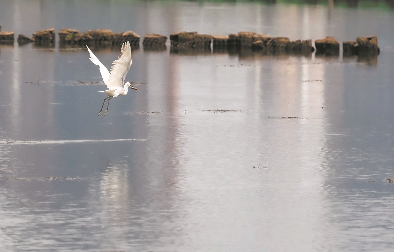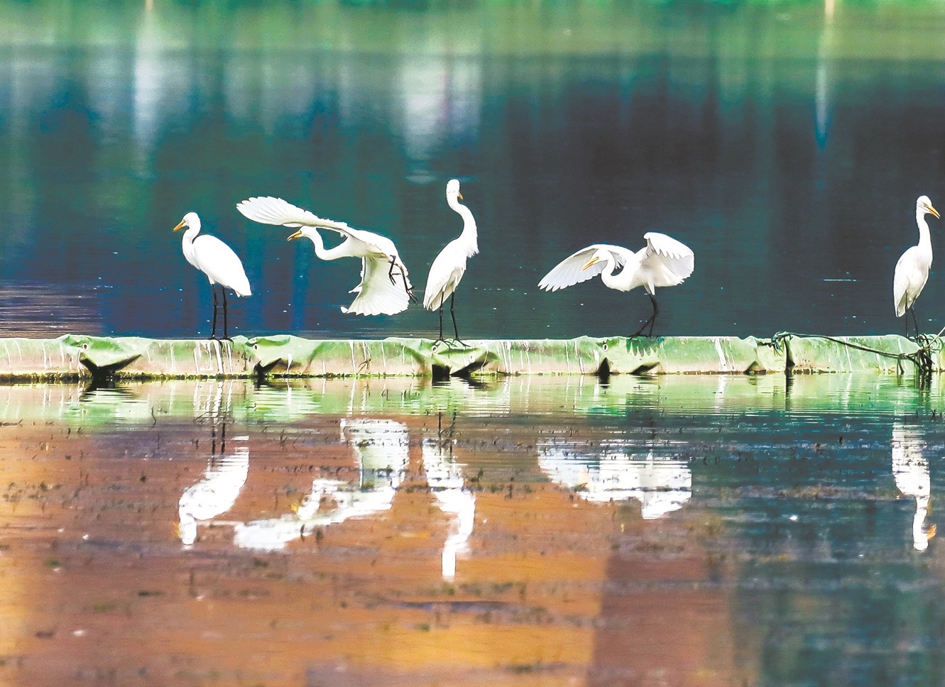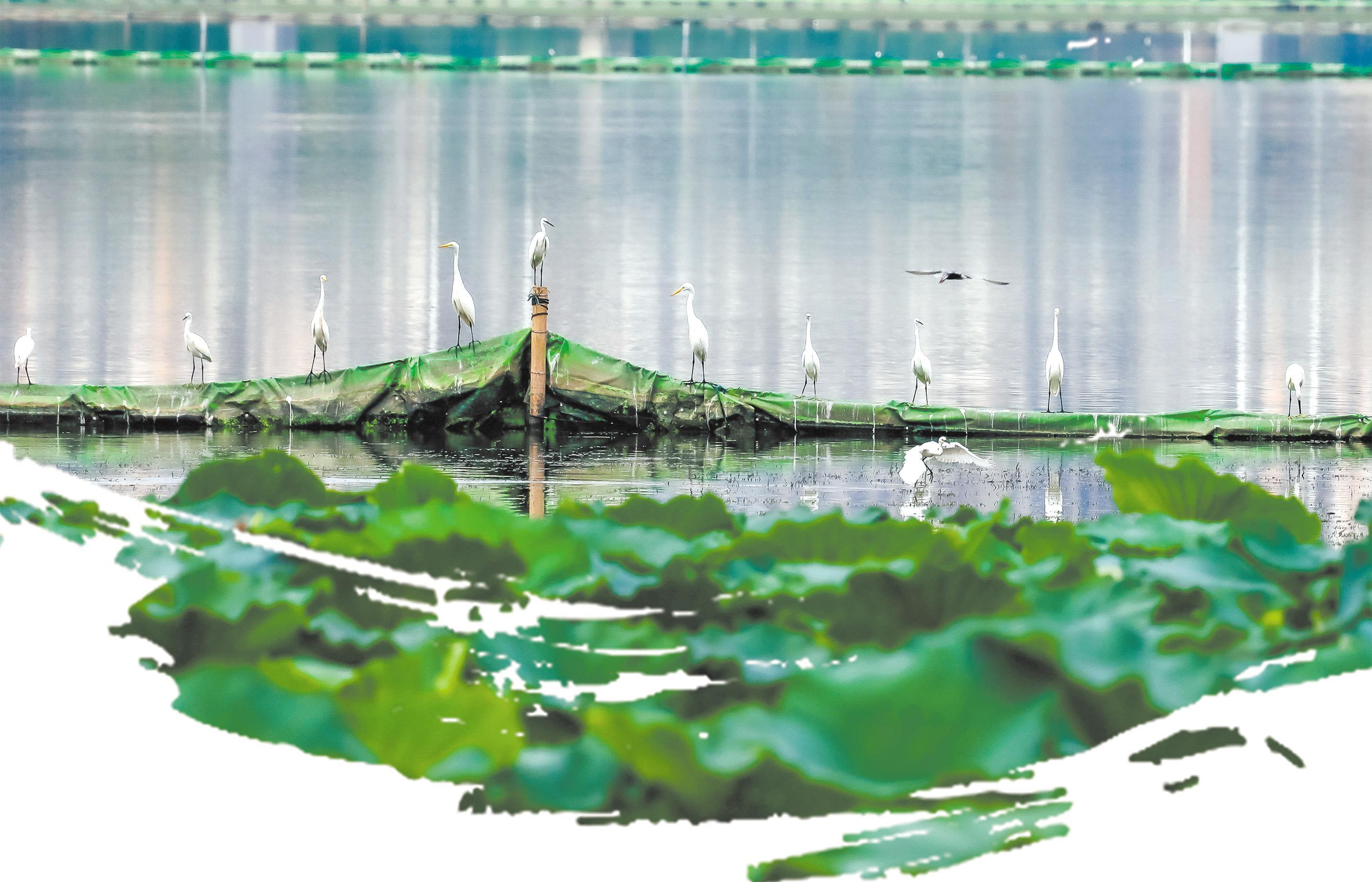 8月21日,武汉市武昌区沙湖公园水面上,大批鹭鸟云集在此嬉戏、觅食,沙湖公园紧邻长江,是存在于武昌区闹市中的一片城市湿地公园。近年来,沙湖公园经过水体治理,生态环境逐步改善,各种水鸟数量明显增加。
