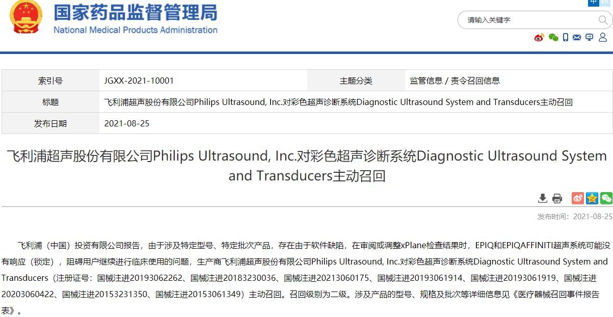 中国经济网北京8月27日讯(记者马先震 孙辰炜) 国家药品监督管理局网站近日发布了飞利浦超声股份有限公司Philips Ultrasound, Inc.对彩色超声诊断系统Diagnostic Ultrasound System and Transducers主动召回得公告。日前,飞利浦(中国)投资有限公司报告,由于涉及特定型号、特定批次产品,存在由于软件缺陷,在审阅或调整xPlane检查结果时,EPIQ和EPIQAFFINITI超声系统可能没有响应(锁定),阻碍用户继续进行临床使用的问题,生产商飞利浦超声股份有限公司Philips Ultrasound, Inc.对彩色超声诊断系统Diagnostic Ultrasound System and Transducers(注册证号:国械注进20193062262、国械注进20183230036、国械注进20213060175、国械注进20193061914、国械注进20193061919、国械注进20203060422、国械注进20153231350、国械注进20153061349)主动召回。召回级别为二级。