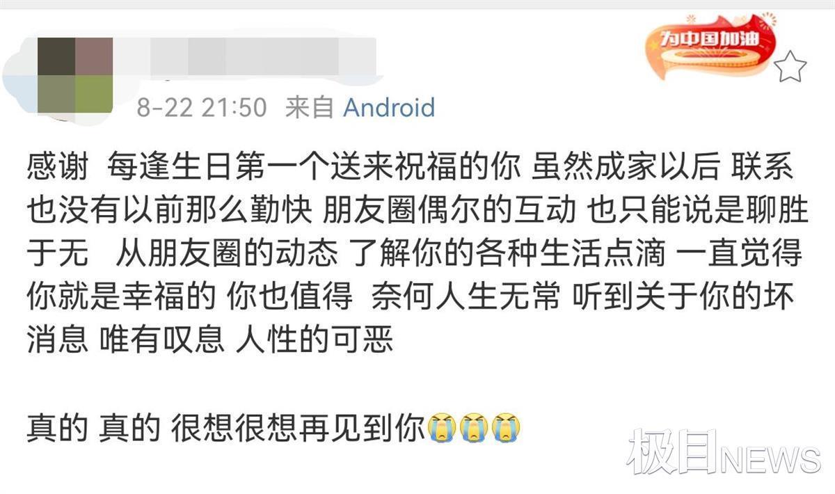 “感谢每逢生日第一个送来祝福的你,真的真的很想再见到你。”一名好友得知小雯的遭遇后,在微博发文感叹,“虽然成家以后联系没有以前那么勤快,只能从朋友圈的动态,了解你的各种生活点滴。一直觉得你就是幸福的,你也值得。奈何人生无常,听到关于你的坏消息,唯有叹息,人性的可恶。”