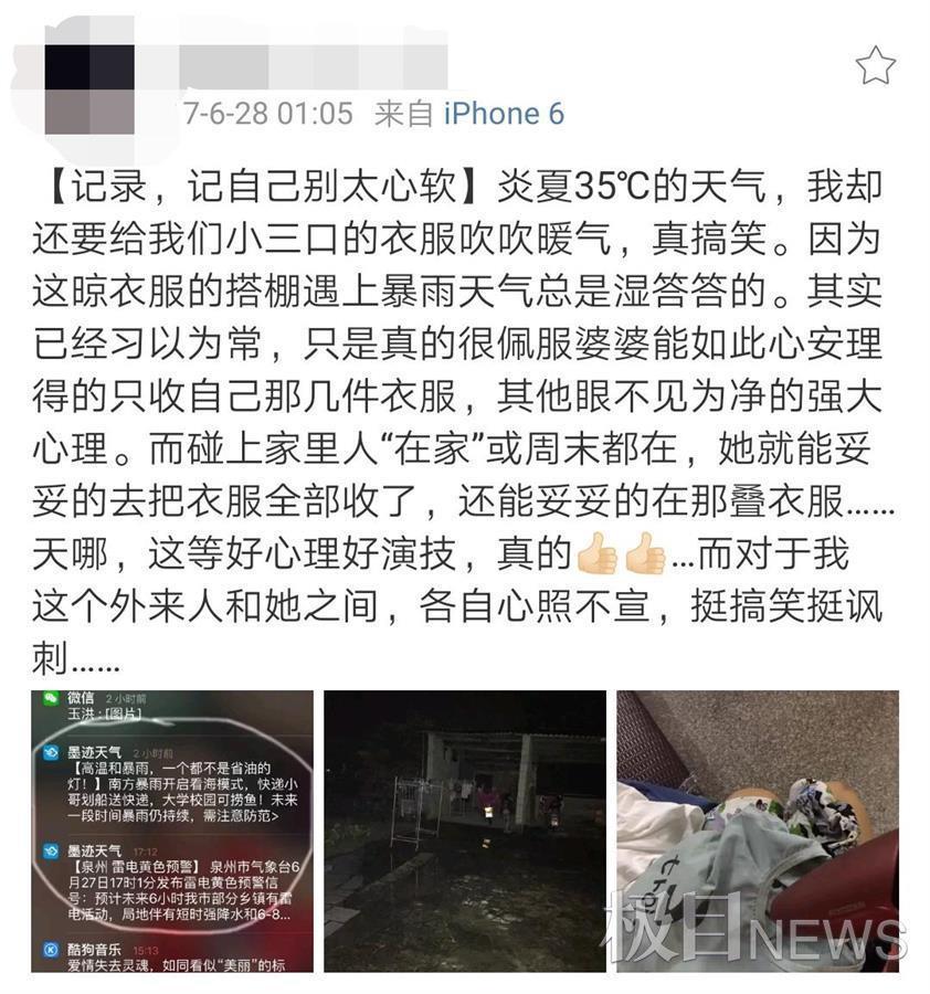 2017年6月,小雯以“记自己别太心软”为题发发表博文。在她看来,婆婆是个“演员”,平时婆婆总是不收他们小三口的衣服。但每当碰上家里人都在的时候,婆婆不仅会把衣服全部收了,还会帮着把衣服叠了。