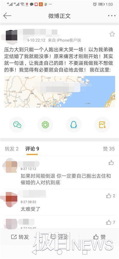 一夜痛哭过后,小雯得到的是这样一句话:在弟弟成婚前,必须带个男朋友回家,并确定下关系。在微博中小雯回应道:“晚婚了又怎样,再不行就租个(男朋友)回来。”
