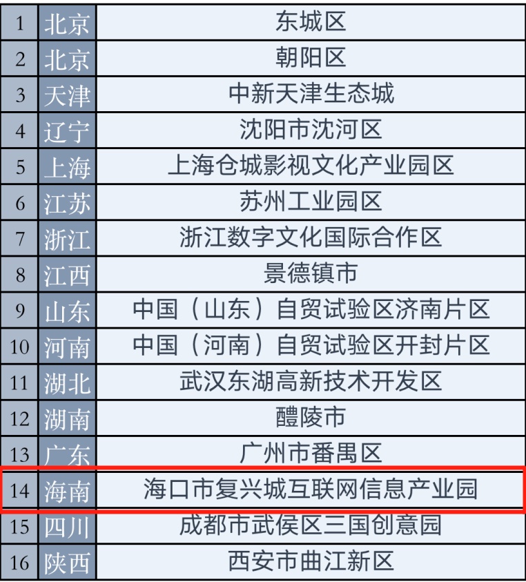 截至目前,海口复兴城互联网信息产业园已获得海南自由贸易港重点园区、国家文化出口基地、国家海外人才离岸创新创业基地、国家级科技企业孵化器、国家小型微型企业创业创新示范基地、全国青年创业示范园区、全国创业孵化示范基地、中国乡村旅游创客示范基地、海南自由贸易港网红孵化示范基地等荣誉。