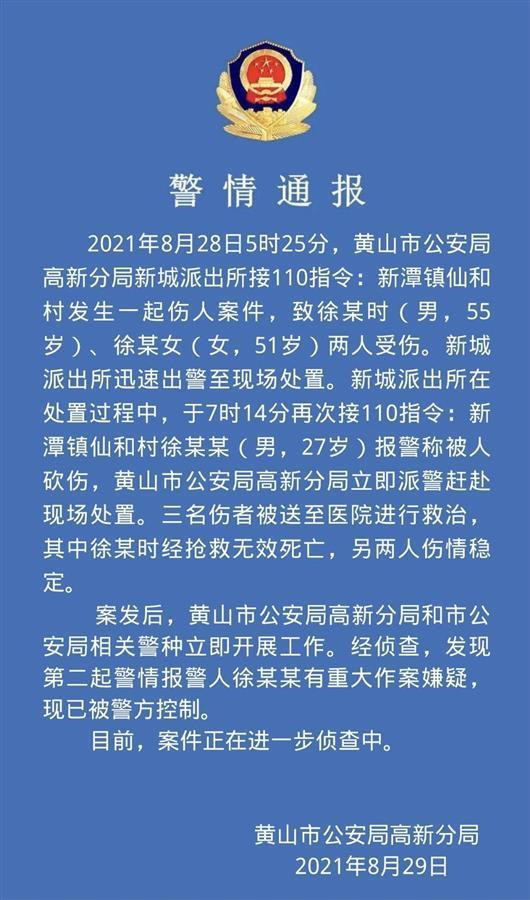 29日上午,黄山市公安局高新分局就此案发布警情通报,8月28日早上5时25分,黄山市公安局高新分局新城派出所接警称新潭镇仙和村发生一起伤人案件,致徐某时(男,55岁)、徐某女(女,51岁)两人受伤。新城派出所迅速出警至现场处置。派出所在处置过程中,于7时14分再次接警,称新潭镇仙和村徐某某(男,27岁)报警称被人砍伤,黄山市公安局高新分局立即派警赶赴现场处置。三名伤者被送至医院进行救治,其中徐某时经抢救无效死亡,另两人伤情稳定。