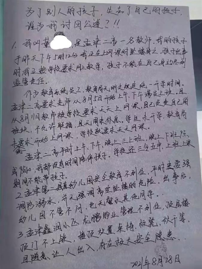29日,有网传消息称,此事发生在孟津区鑫润阳光家园小区,坠亡儿童的母亲是当地一所高中的教师。极目新闻记者注意到,另有网友发布了两张以该教师名义手写的说明,疑似该教师在文中称,孩子坠亡时,她正按学校要求在进行网上教学,没有在孩子身边尽到监管责任。她还称,学校从8月5日开始上午、下午满员上班,8月11日开始要求教师天天上网课。