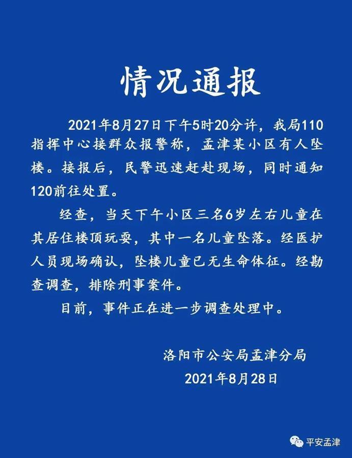 据平安孟津微信公众号消息,8月27日下午,佳佳及其他两名6岁左右的儿童在居住楼顶玩耍,佳佳不幸坠楼。警方接警后赶赴现场,经医护人员现场确认,佳佳已无生命体征。