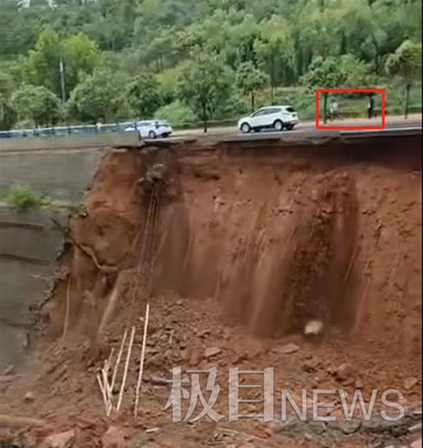 网传视频显示,事发路段位于一小区旁边的护坡上,路面与小区存在较大的高度差。路面停有车辆,还有两人撑伞站在路上。突然,随着轰隆一声巨响,路面底下的护坡发生坍塌。撑伞的两人感觉有异,一路狂奔到安全区域。停在路边的小轿车也安然无恙。