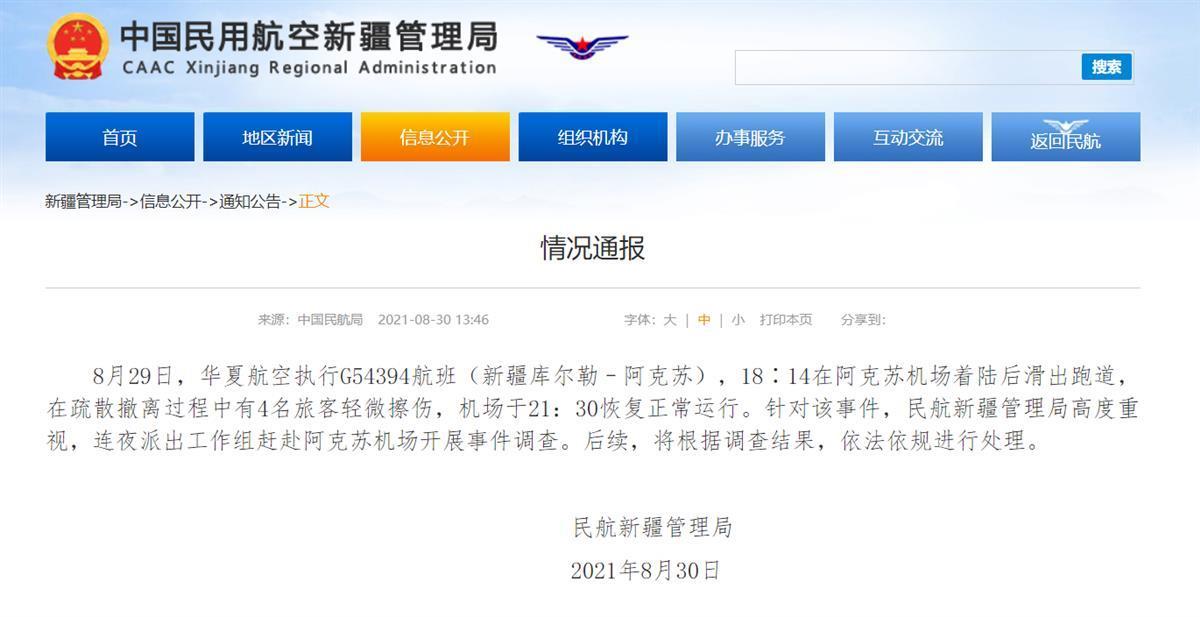 8月29日下午,华夏航空一架客机在新疆阿克苏机场落地后冲出跑道,造成4名乘客轻微擦伤(据8月30日极目新闻)。30日下午,民航新疆管理局发布情况通报称,已连夜派出工作组开展调查,将根据调查结果依法依规进行处理。