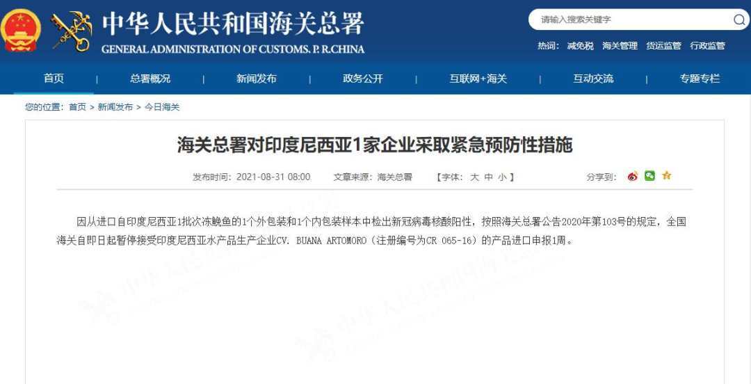 因从进口自印度尼西亚1批次冻鮸鱼的1个外包装和1个内包装样本中检出新冠病毒核酸阳性,按照海关总署公告2020年第103号的规定,全国海关自即日起暂停接受印度尼西亚水产品生产企业CV. BUANA ARTOMORO(注册编号为CR 065-16)的产品进口申报1周。