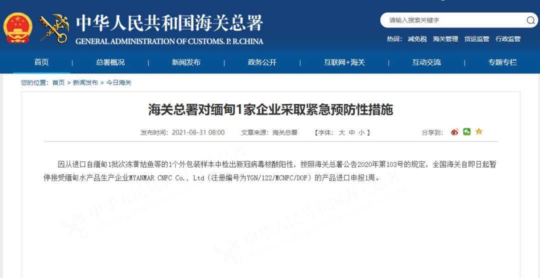 因从进口自缅甸1批次冻黄姑鱼等的1个外包装样本中检出新冠病毒核酸阳性,按照海关总署公告2020年第103号的规定,全国海关自即日起暂停接受缅甸水产品生产企业MYANMAR CNFC Co., Ltd(注册编号为YGN/122/MCNFC/DOF)的产品进口申报1周。