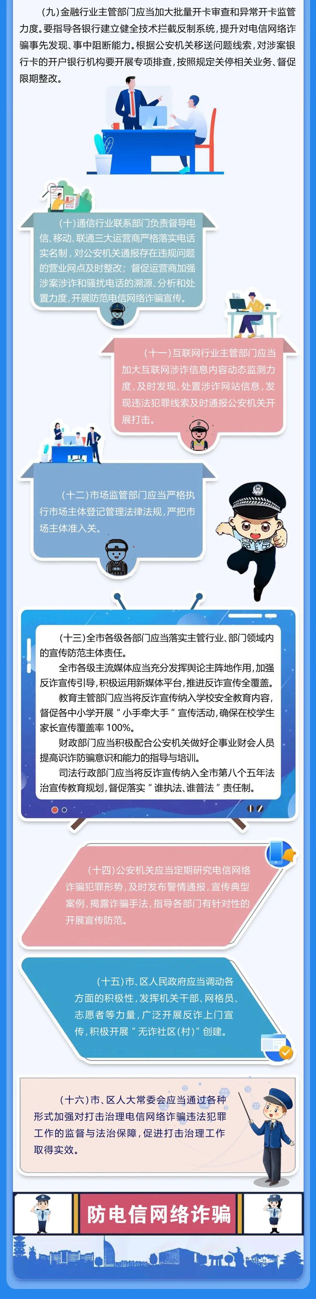 要求市、区人民政府将打击治理电信网络诈骗违法犯罪工作作为依法治国、平安建设的重要内容,健全市、区两级联席会议制度,建强市、区反电信网络诈骗中心,坚持党委领导、政府主导、公安主打、部门主管、行业主责、全社会参与的打击治理电信网络诈骗违法犯罪的长效工作机制,努力形成打击治理电信网络诈骗犯罪合力。