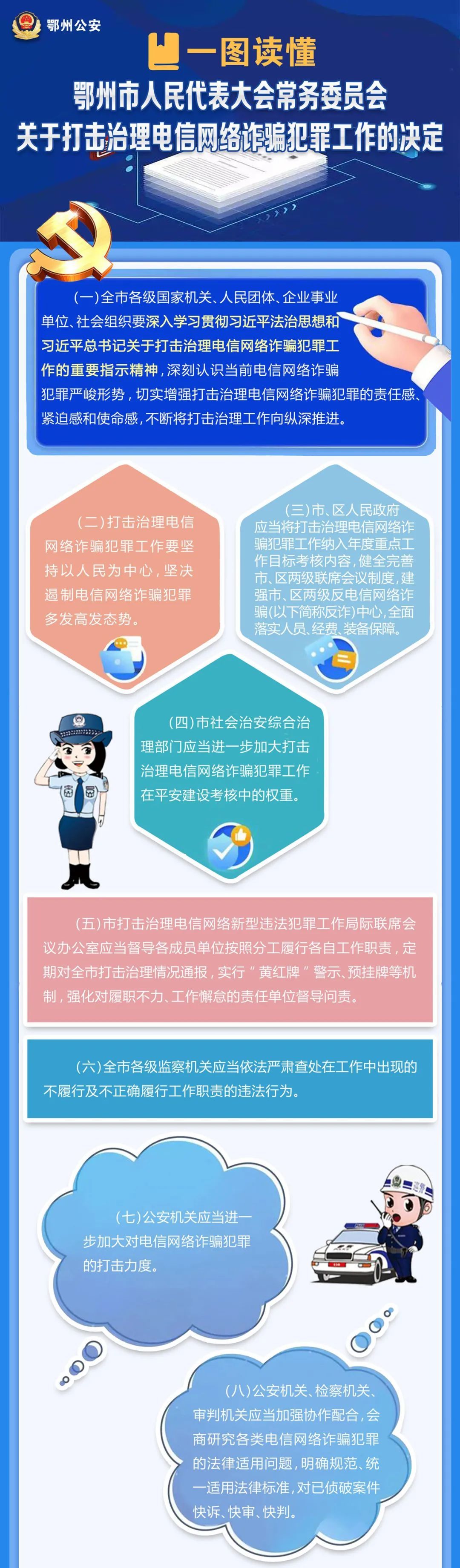 8月30日,鄂州市第八届人大常委会举行第三十三次会议,表决通过《鄂州市人民代表大会常务委员会关于打击治理电信网络诈骗违法犯罪工作的决定(草案)》(简称《决定》),组织动员全社会力量,进一步加大对电信网络诈骗违法犯罪的打击治理力度,坚决扼制电信网络诈骗案件高发态势,为建设平安法治鄂州创造良好的社会治安环境。