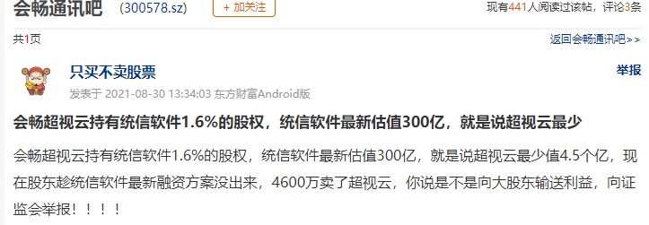 上述公告披露的第二日,有股民在股吧质疑上述关联转让,"现在股东趁统信软件最新融资方案没出来,4600万卖了超视云,你说是不是向大股东输送利益"。