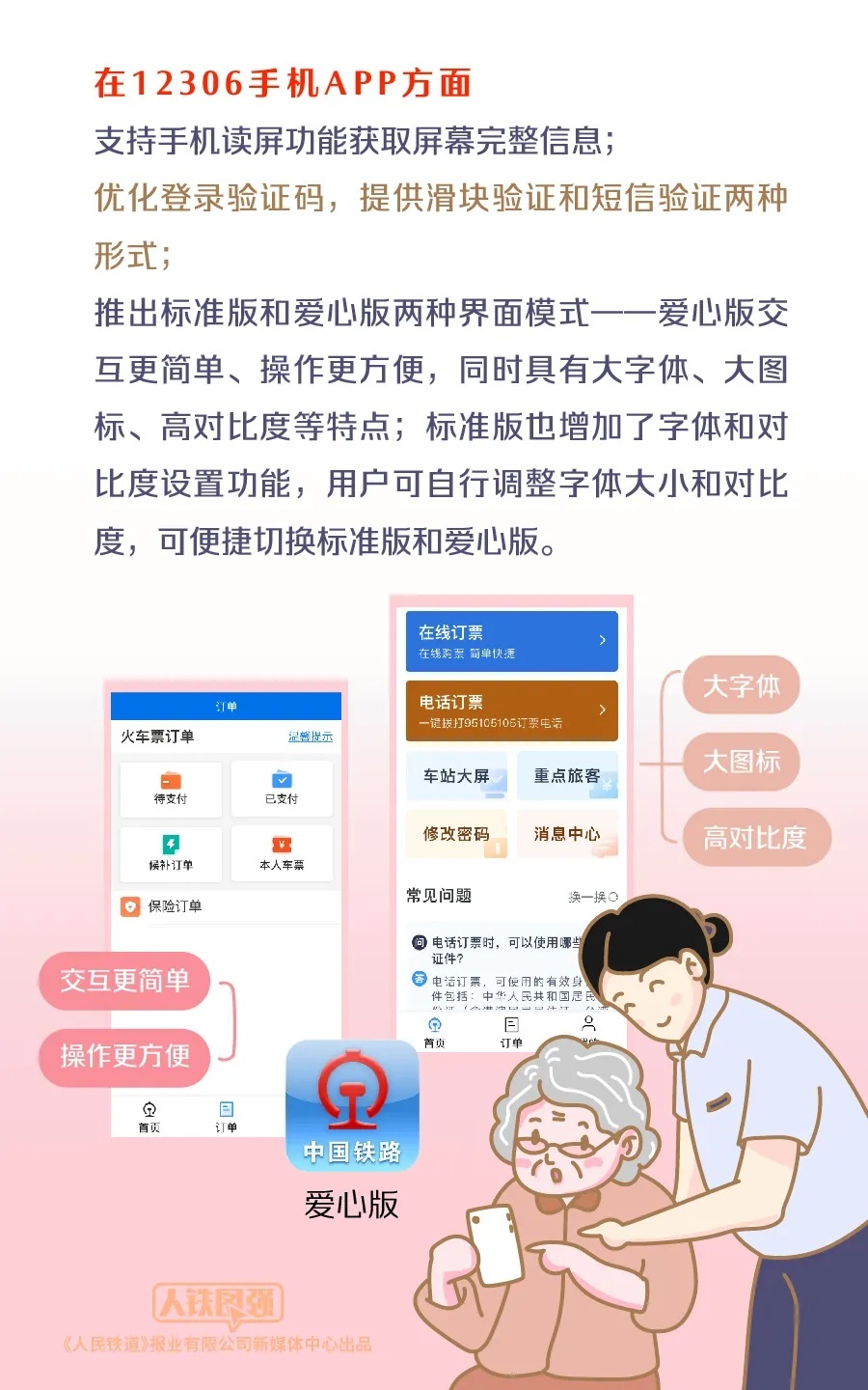 铁路12306科研团队认真对照国家关于适老化无障碍功能指引,结合广大旅客需求,制定了技术改造方案,进行了系统开发和安全测评,较好地实现了各项功能。