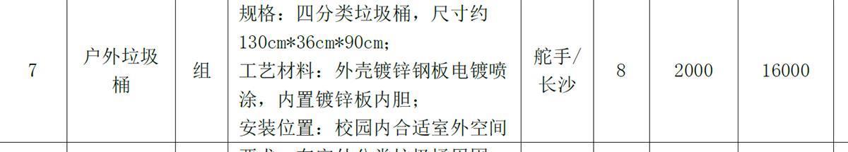 该公告的附件显示,4所幼儿园共采购了8组户外垃圾桶,单价2000元。垃圾桶的规格为四分类垃圾桶,尺寸为130cm×36cm×90cm,工艺材料为外壳镀锌钢板电镀喷涂,内置镀锌板内胆。