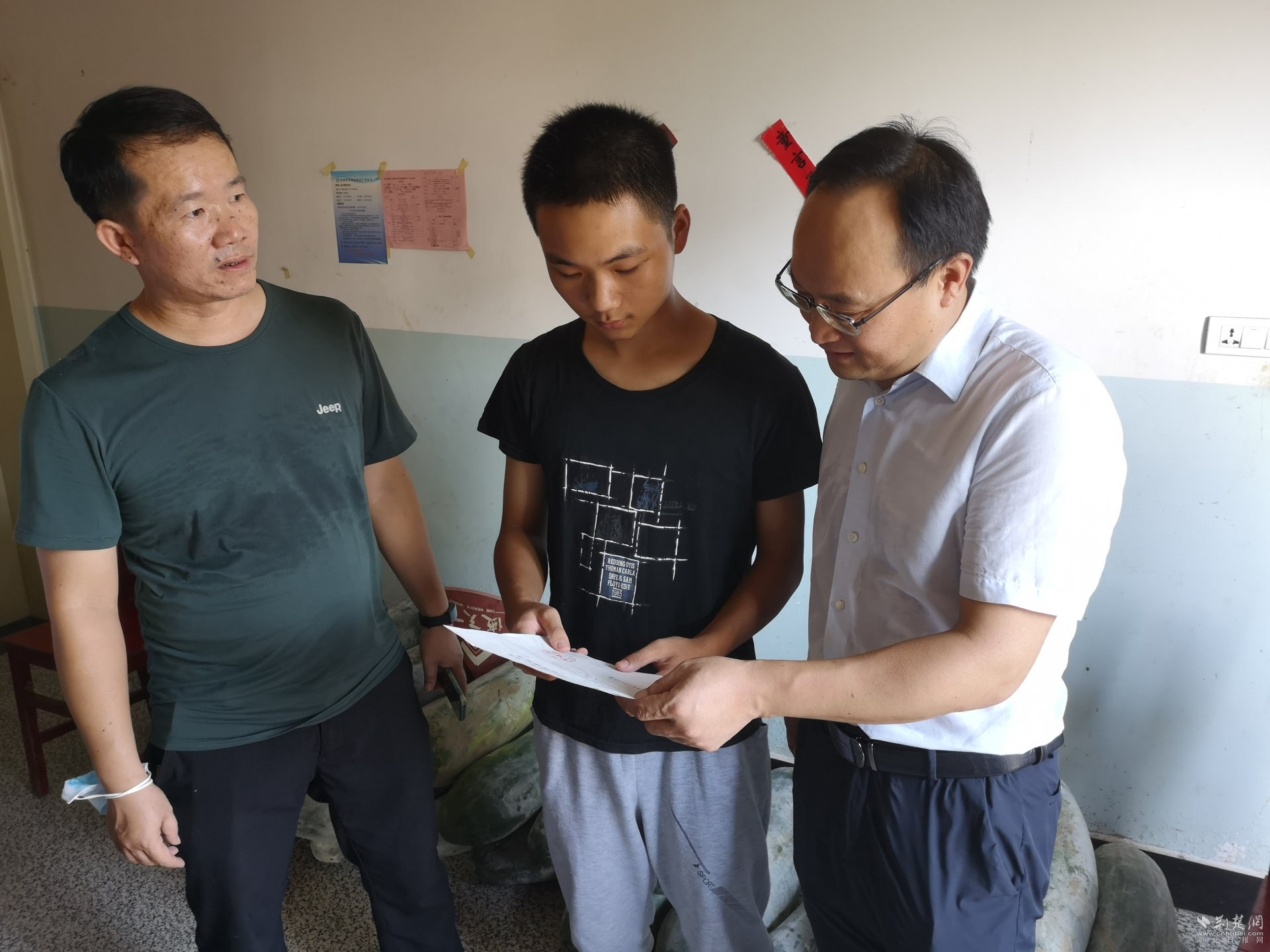 孝南区民政局长万峰(右)在看涂倩东的大学录取通知书。通讯员 供图