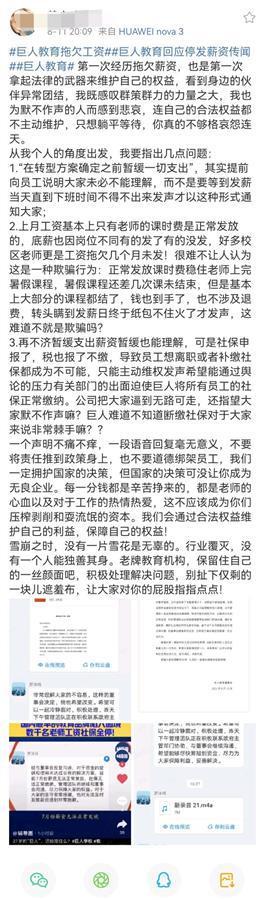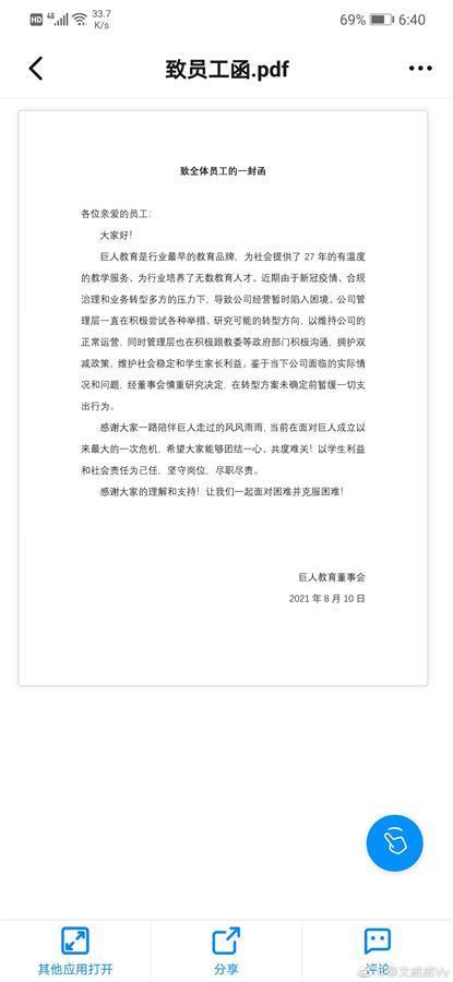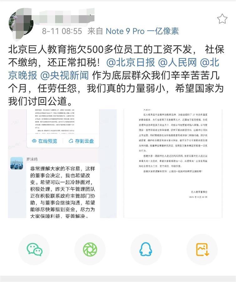 极目新闻记者注意到,8月中旬,多位网友曾在微博发文称巨人教育存在拖欠薪资、未缴社保的情况,为此,巨人教育董事会还曾发布《致全体员工的一封函》,称由于受到新冠疫情、合规治理和业务转型多方压力,导致经营暂时陷入困境,目前将暂缓一切支出行为,并称当前面对的困难,是巨人教育成立以来最大的一次危机,希望员工们能一起面对、克服。遗憾的是,巨人教育最终还是未能挺过这次危机。