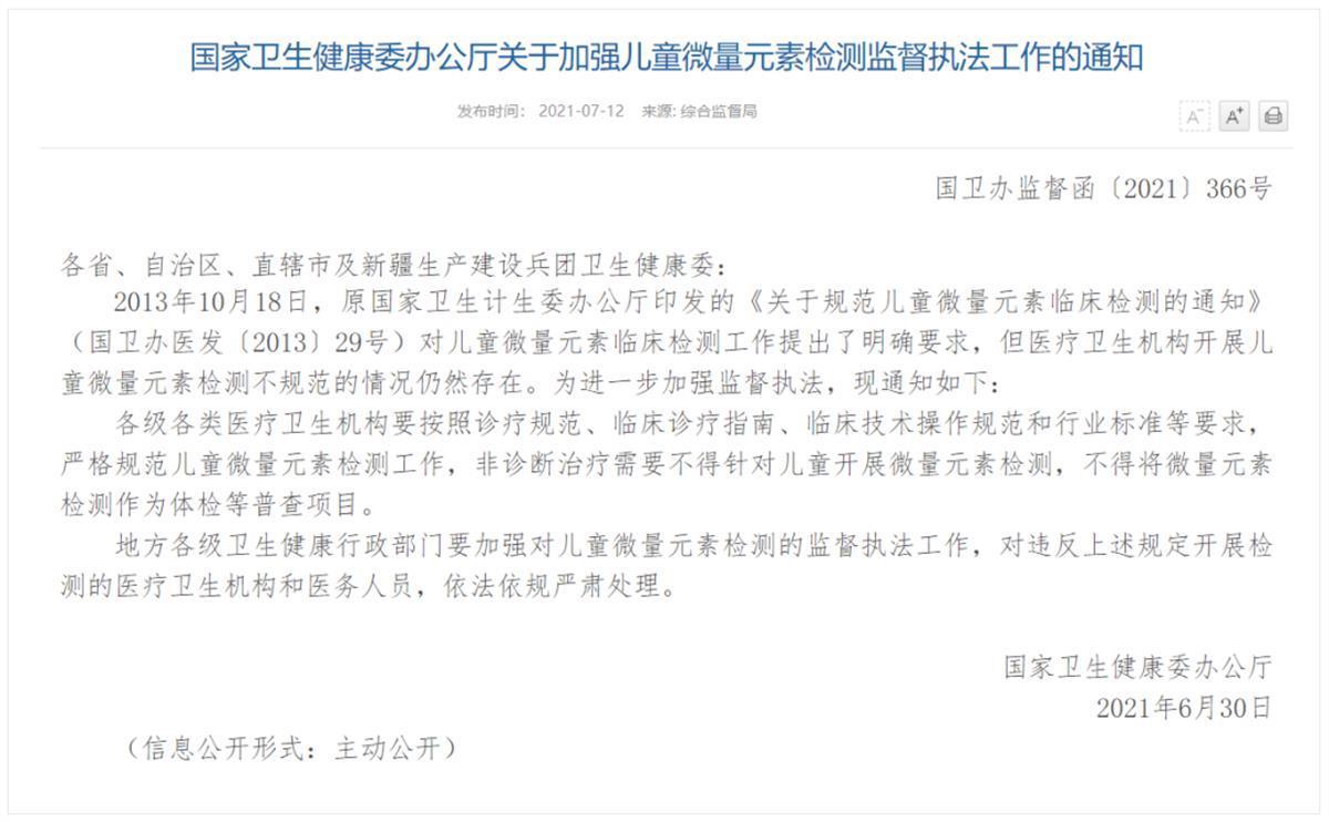 多年来,微量元素检测一直备受关注。日前,国家卫健委办公厅发布了《关于加强儿童微量元素检测监督执法工作的通知》,要求不得将微量元素检测纳入儿童体检普检项目。消息一出,“儿童微量元素检测”再次冲上网络话题热搜。