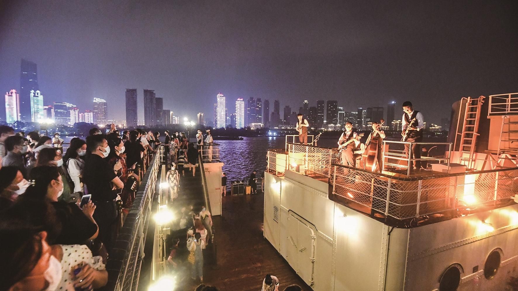 因疫情防控需求沉寂了近一个月的《知音号》演出,于9月1日晚复演迎客。当晚《知音号》开放公益名额,邀请来自武汉各个社区的30名防疫工作者登船看剧,夜赏璀璨灯光秀。游客们在工作人员的指引下,扫码、测温,依次有序入园。