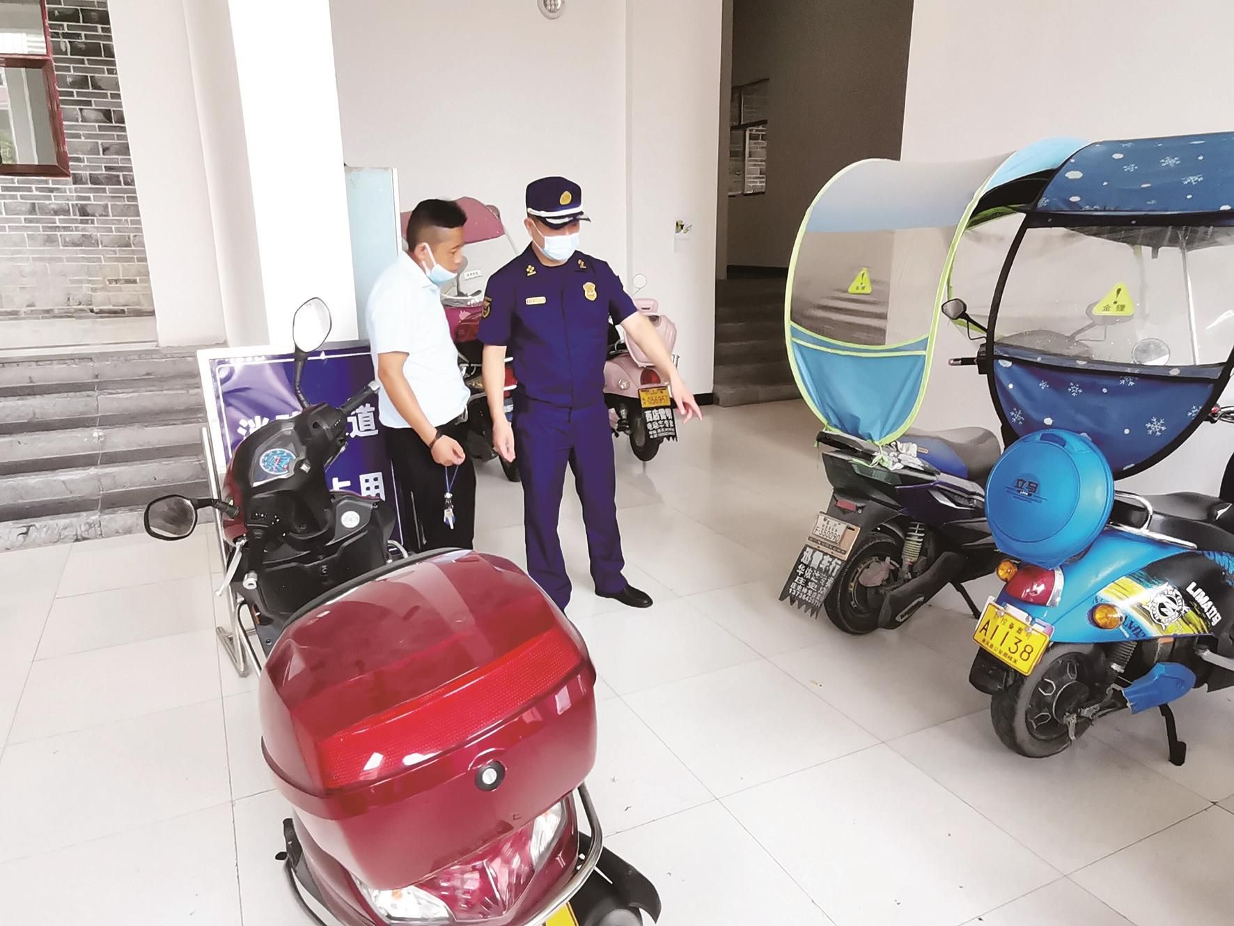 8月12日,恩施州来凤县消防救援大队执法人员对辖区某高层住宅小区进行检查时,发现6栋首层公共门厅内停放有多辆电动自行车。执法人员责令小区物业通知车主将电动车挪至室外。