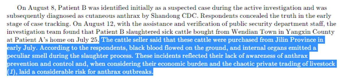 报告提到,引发本次阳信县炭疽疫情的病牛是7月从吉林省购买的(图源:相关报告截图)