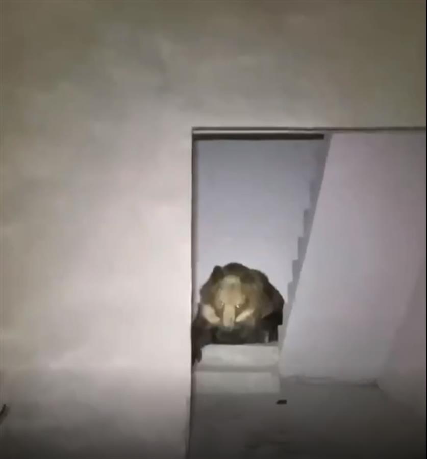 据杨效东提供的视频显示,他使用手电筒照射这头熊,本来趴在民房楼梯的熊,开始爬行。杨效东与熊对视一阵后,吓得后退,熊离开了民房,钻进一旁的草丛。