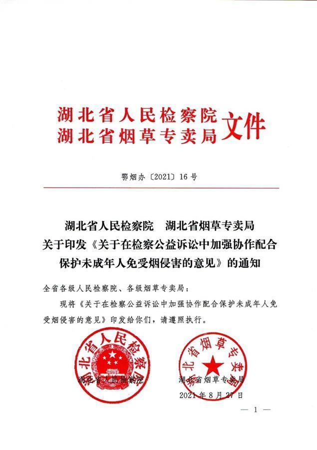 近日,湖北省人民检察院、湖北省烟草专卖局联合印发了《关于在检察公益诉讼中加强协作配合保护未成年人免受烟侵害的意见》。这是全国省级层面率先出台的保护未成年人免受烟侵害的规定。