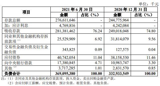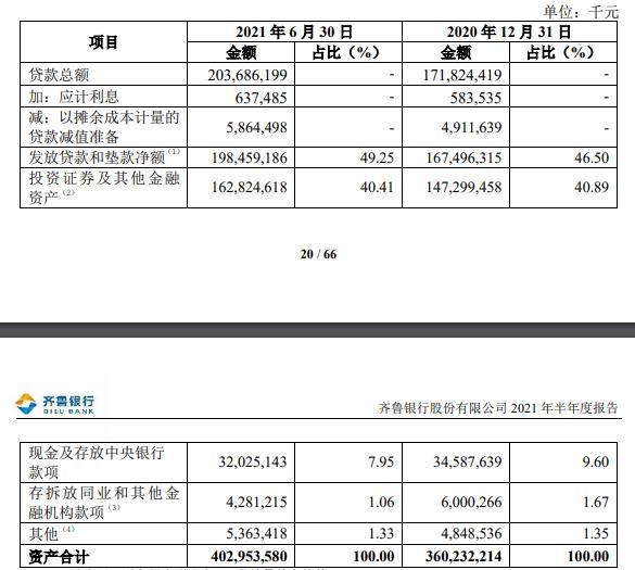 截至2021年6月30日,齐鲁银行资产总额4029.54亿元,较上年末增长11.86%;贷款2036.86亿元,较上年末增长18.54%,贷款占资产总额比例50.55%,较上年末提升2.85个百分点;负债总额3690.95亿元,较上年末增长10.86%;存款2766.12亿元,较上年末增长13.01%,存款占负债总额比例74.94%,较上年末提升1.42个百分点。