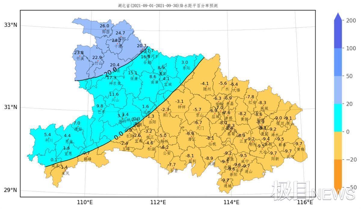 图为:湖北省2021年9月降水距平百分率预测图(%)