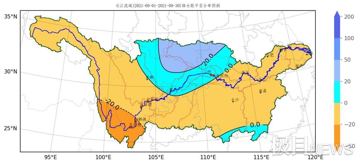图为:长江流域2021年9月降水趋势预测图(%)