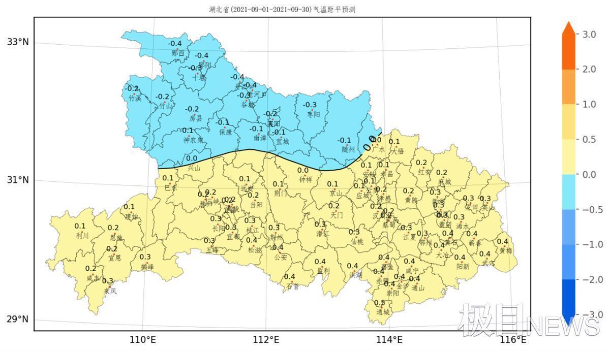 图为:湖北省2021年9月气温距平预测图(℃)