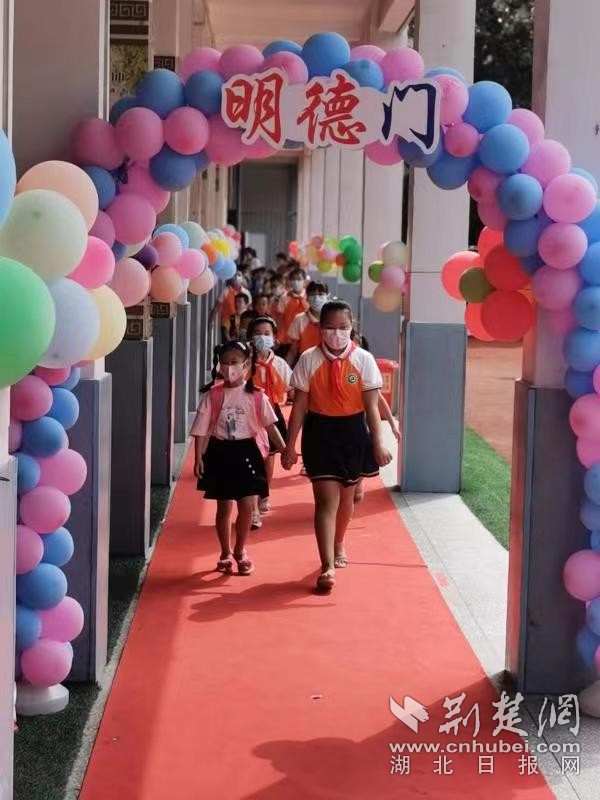云梦县城关二小高年级的同学们带领一年级新生穿过明德门。通讯员 供图