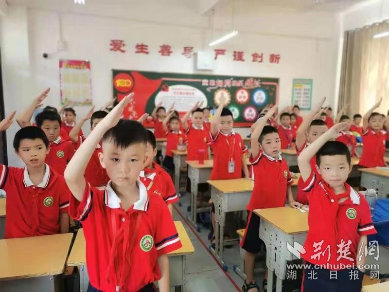 云梦县黄香小学学生在开学第一课上进行规范队礼训练。通讯员 供图