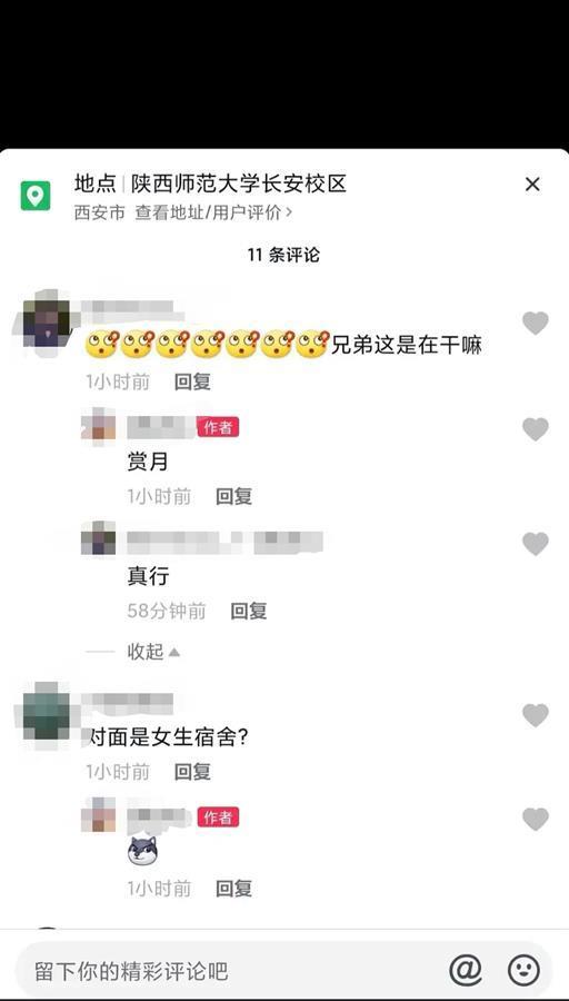 该网友发帖称,在某视频平台发布的视频中,陕西师范大学一男同学拿着手机对准陕西师范大学的女生宿舍楼拍照,同时抽着烟,面部表情看起来很开心。而在视频评论中,该男同学面对网友的提问,称自己拍摄的就是女生宿舍楼,还表示自己是在“赏月”。