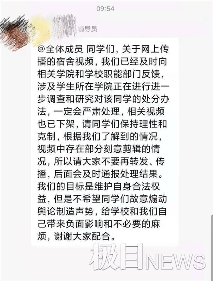 陕西师范大学在读学生张同学告诉极目新闻记者,偷拍事件发生后,自己所在班级的辅导员曾在QQ群里发布消息称,关于网上传播的偷拍宿舍视频,老师已及时向相关学院和学校职能部门反馈,涉及学生所在学院正在进一步调查处理。根据学校了解,相关偷拍视频存在刻意剪辑情况,请同学们不要随意转发、传播视频内容。