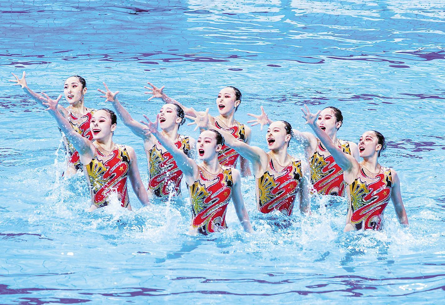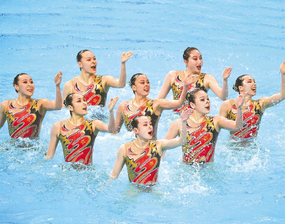 晚上7点,自由自选比赛准时开始。联合队第4个出场。在以琵琶为主旋律的《巾帼英雄》的乐曲中,8位姑娘宛若鱼翔浅底、龙腾出海,在快节奏中行云流水,激起片片浪花轻盈翻卷。她们的动作与音乐每一个节奏精准同步,高难度托举犹如出征的女将,气势磅礴,展现出中华民族的巾帼英雄气概。凭借近乎无可挑剔的表现,联合队获得冠军。