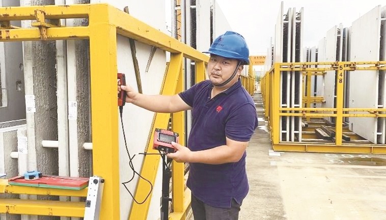 黄蓝相间的机械工厂内,品检员程智武手提工具箱步伐匆匆,作为构件出厂的“最后把关人”,当天,他将对堆场内350个预制构件进行专业检测。