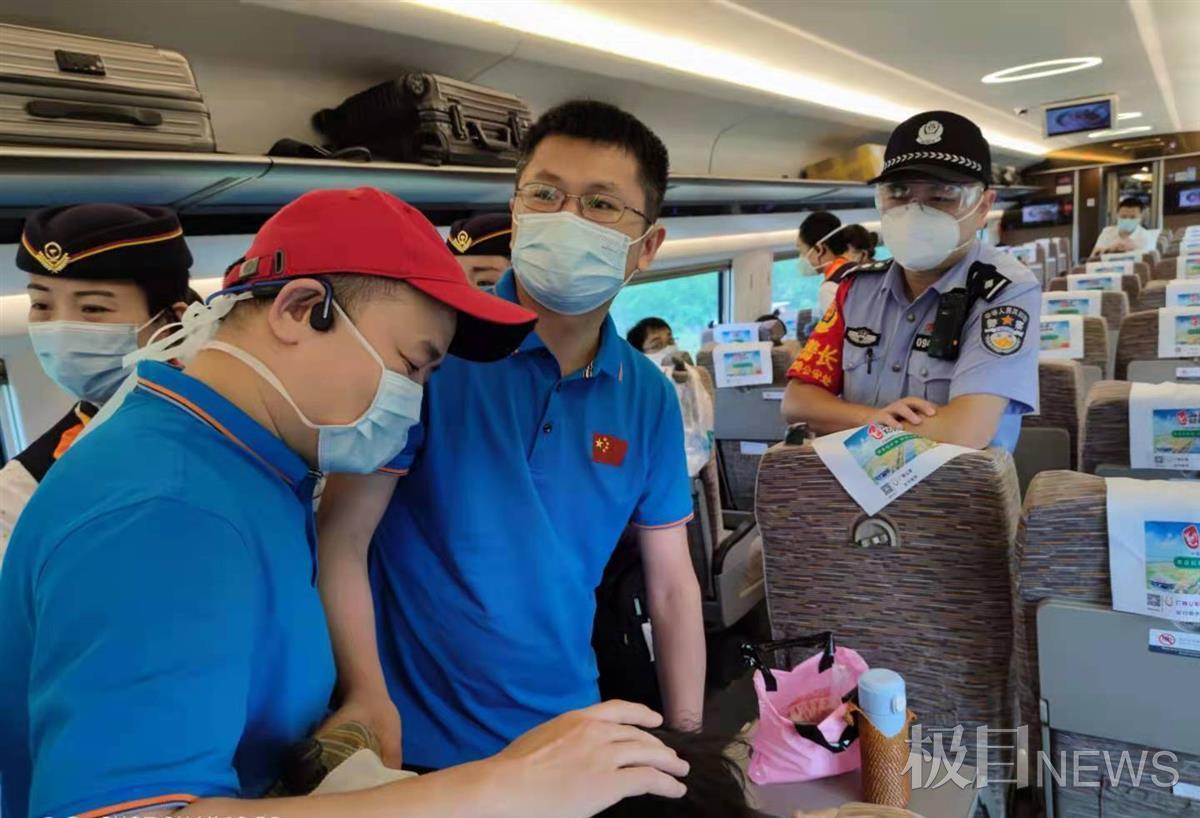 话音未落,坐在5号车厢的吴姣姣等几人毫不犹豫的赶到事发位置,他们身着蓝色制服、胸前镌刻国旗,眼神笃定而自信。