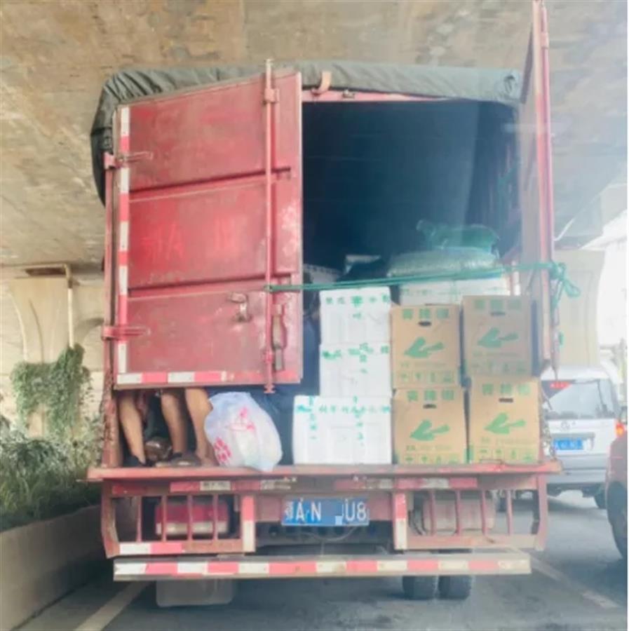 这辆堆满了货物的货车,仔细看,左下角露出几只脚,违法载人!违法地点位于武昌区白沙洲大道。