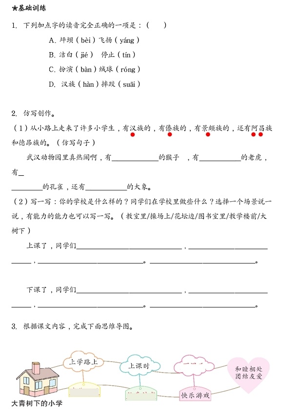 打开三年级(2)班学生高若茗的作业本,一幅清晰的思维导图映入眼帘。记者看到,思维导图以课文标题“大青树下的小学”为中心主题,将“上学路上”“上课时”“和睦相处,团结友爱”“快乐游戏”逐个串联起来,形成了一个知识体系框架。