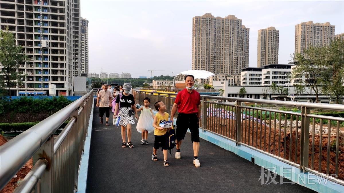 开学这几天,走过这座天桥的光谷十八小的学生家长,在微信群里一片叫好。三年级新生王依凡的妈妈占丹丹,家住航天城小区,家里几个孩子就她一个人带。为了方便出行,经社区协调,这个小区在天桥边的小门分时段开放,这样该小区的孩子一出门就可以上天桥,下了天桥就是学校,几分钟能到。因为很近,占丹丹告诉极目新闻记者,她准备以后让孩子自己上学放学。
