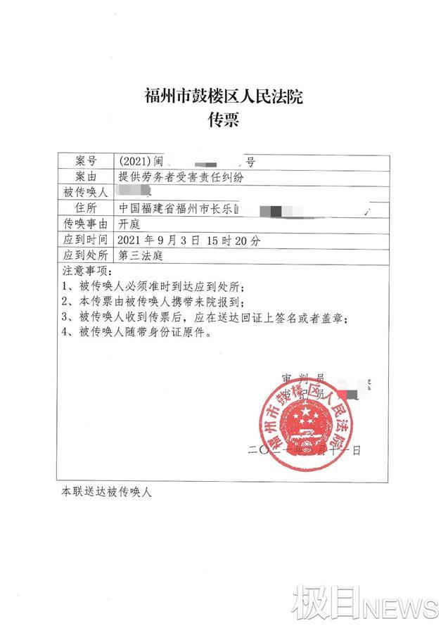据被害人家属代理律师周兆成提供的福州市鼓楼区人民法院传票显示,2021年9月3日下午3时20分,福州市鼓楼区人民法院开庭审理福州少年被杀焚尸民事赔偿案件。极目新闻记者从周兆成处获悉,当天鼓楼区人民法院并未宣判,选择另行宣判。