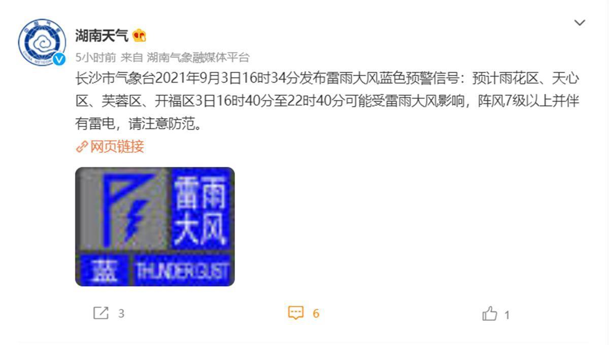 长沙市气象台于9月3日下午4时34分发布雷雨大风蓝色预警。当晚8时左右,极目新闻记者从长沙市气象台获悉,在当天下午的雷雨天气过程中,长沙市观沙岭、荷花园、捞刀河等地出现了接近8级的大风,最大降水量出现在荷花园,为64.2mm。工作人员介绍,此次的雷雨大风天气与短时强降雨天气有所不同,局地因强对流导致大风、冰雹的可能性较大。