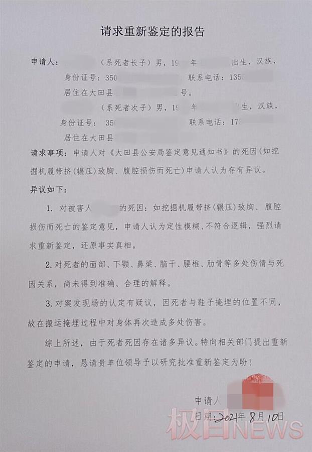 8月10日,黄永成向公安机关申请对其父的死亡原因重新鉴定。在黄永成提供的《请求重新鉴定的报告》中,他认为“死者的面部、下颌、鼻梁、脑干、腰椎、肋骨等多处伤情与死因关系,尚未得到明确解释。”
