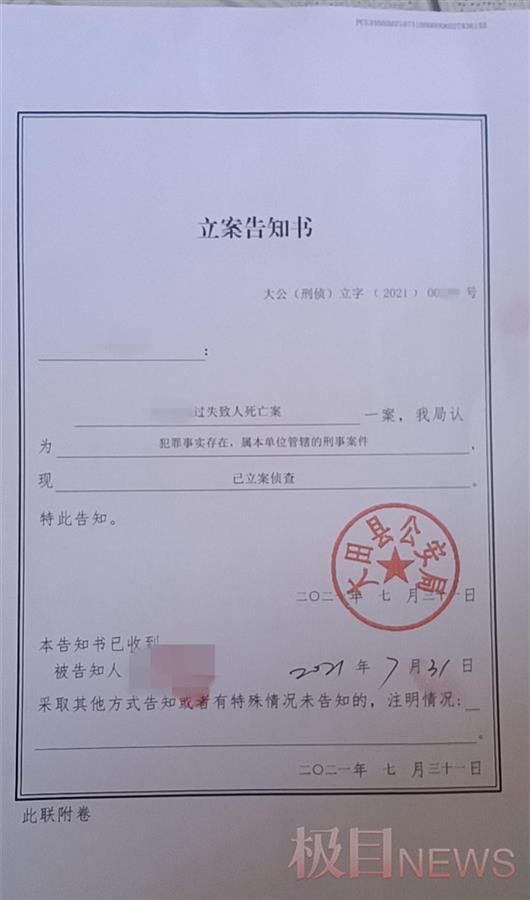 大田县公安局还于7月31日出具了一份《立案告知书》,“洪高阳过失致人死亡案”已立案调查。